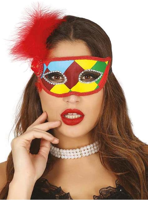 Antifaz de arlequín multicolor con pluma roja para adulto